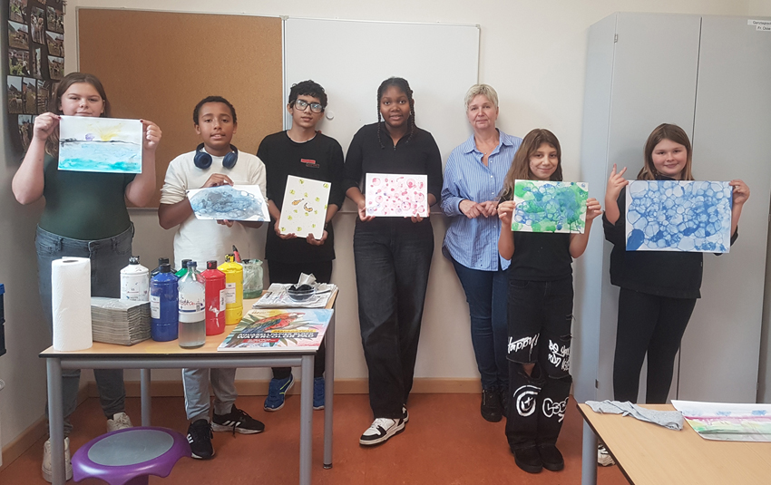 Im Ganztag haben wir uns sehr über den Besuch der Hobbymalerin Monika Steinhoff gefreut. Mit viel Geduld und Begeisterung hat sie den Schülerinnen und Schülern verschiedene kreative Maltechniken vorgestellt und gemeinsam mit ihnen ausprobiert.