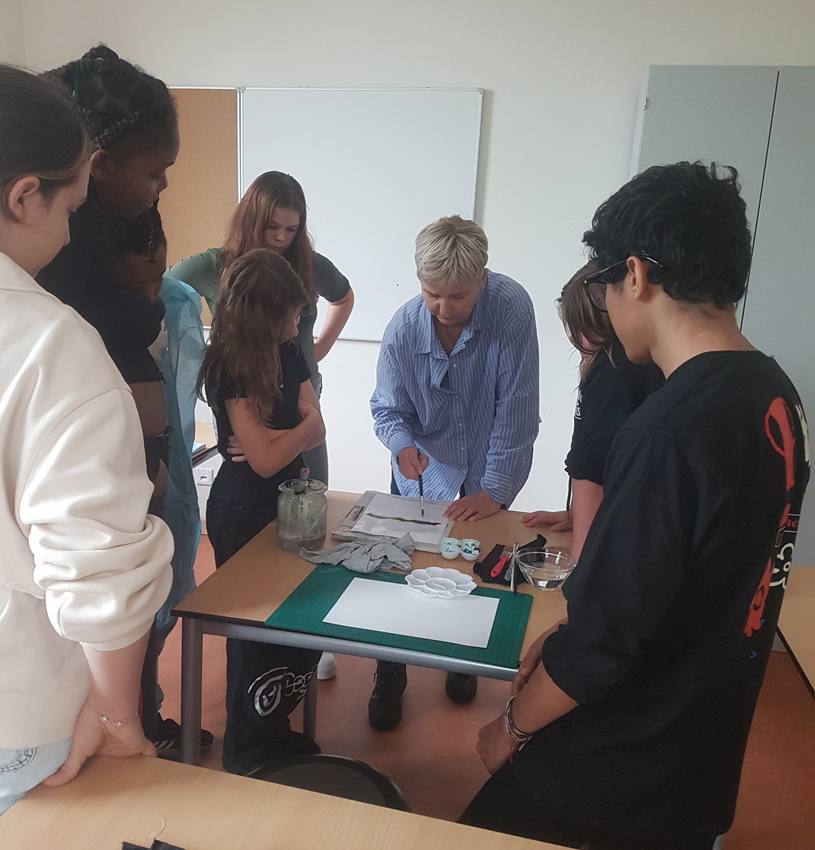 Im Ganztag haben wir uns sehr über den Besuch der Hobbymalerin Monika Steinhoff gefreut. Mit viel Geduld und Begeisterung hat sie den Schülerinnen und Schülern verschiedene kreative Maltechniken vorgestellt und gemeinsam mit ihnen ausprobiert.